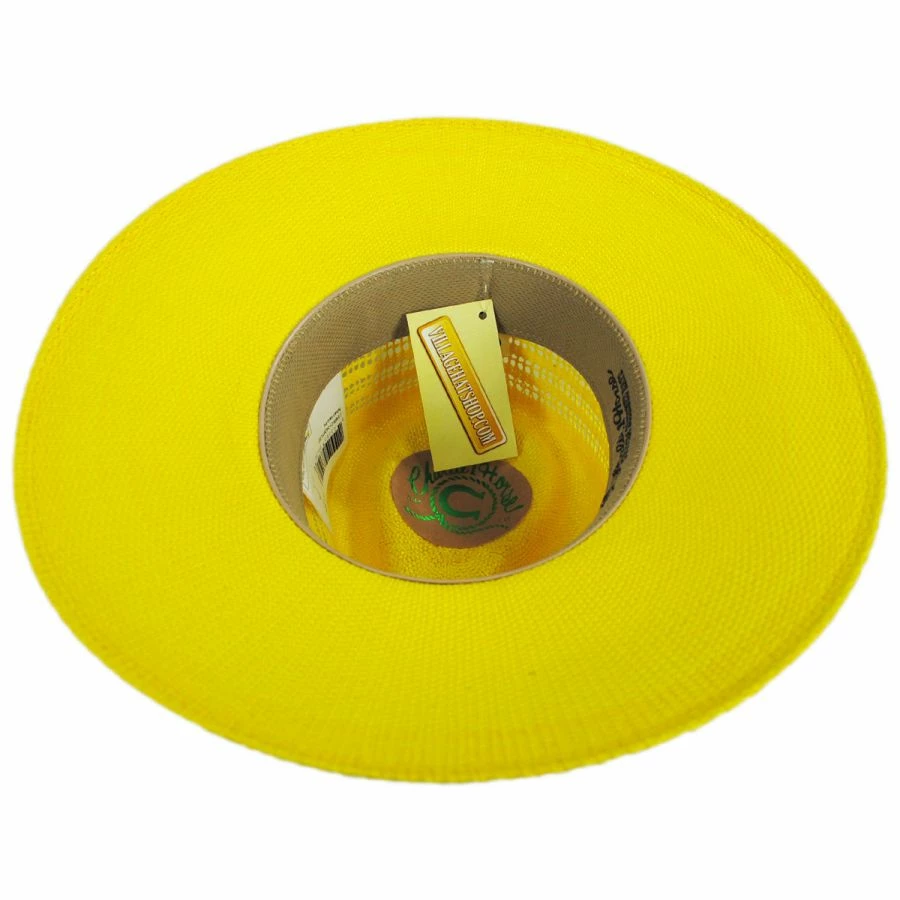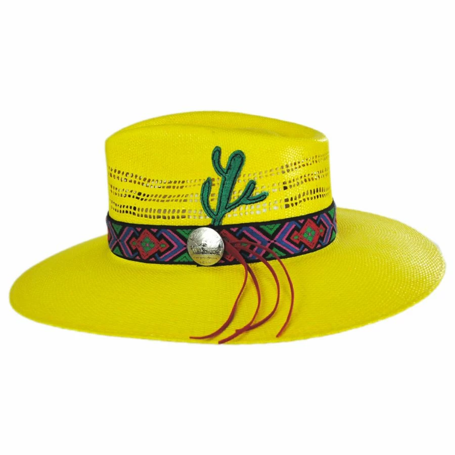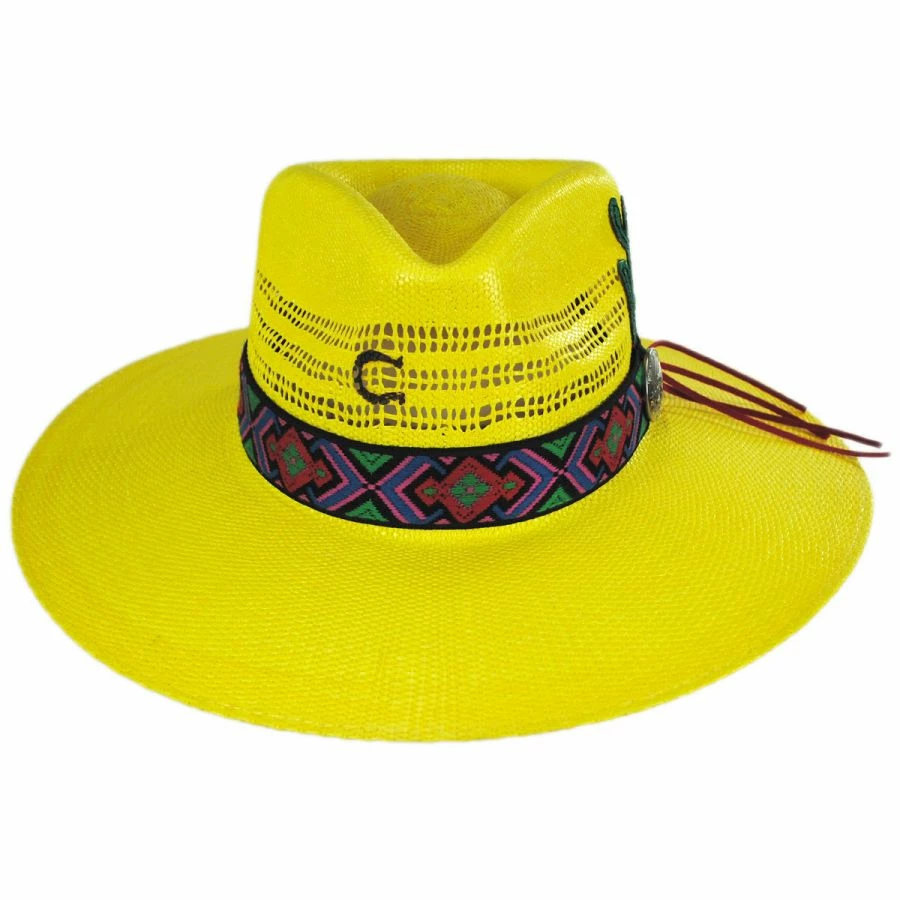 Want to stand out in the crowd, well we have just the hat…the Mariachi Toyo Straw Fedora Hat by Charlie 1 Horse is all about color, bright accents and making a statement! Made in Mexico, the woven toyo straw body has been finished in a fun shade of yellow from the brim to the top of the crown. An embroidered multicolored hat band wraps around the crown to form a vibrant hat band and this is topped off with a concho, red tassels and cactus embroidered patch. The vented crown and unlined interior will keep you cool and collected no matter how many heads you turn with the Mariachi by Charlie 1 Horse.