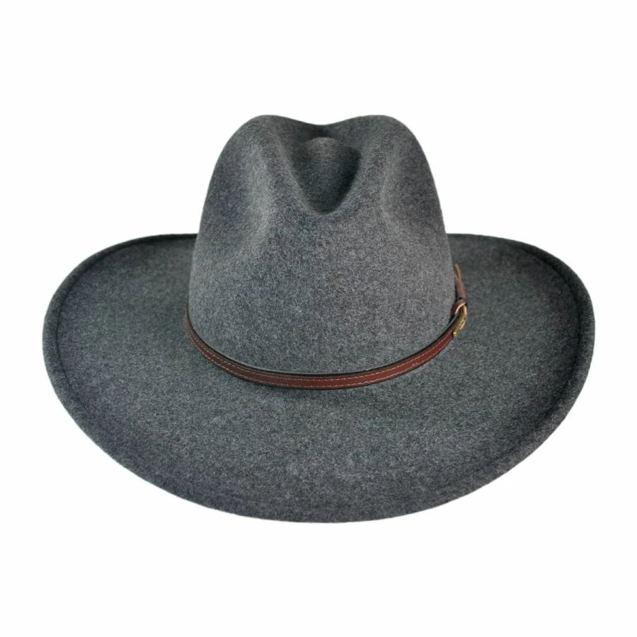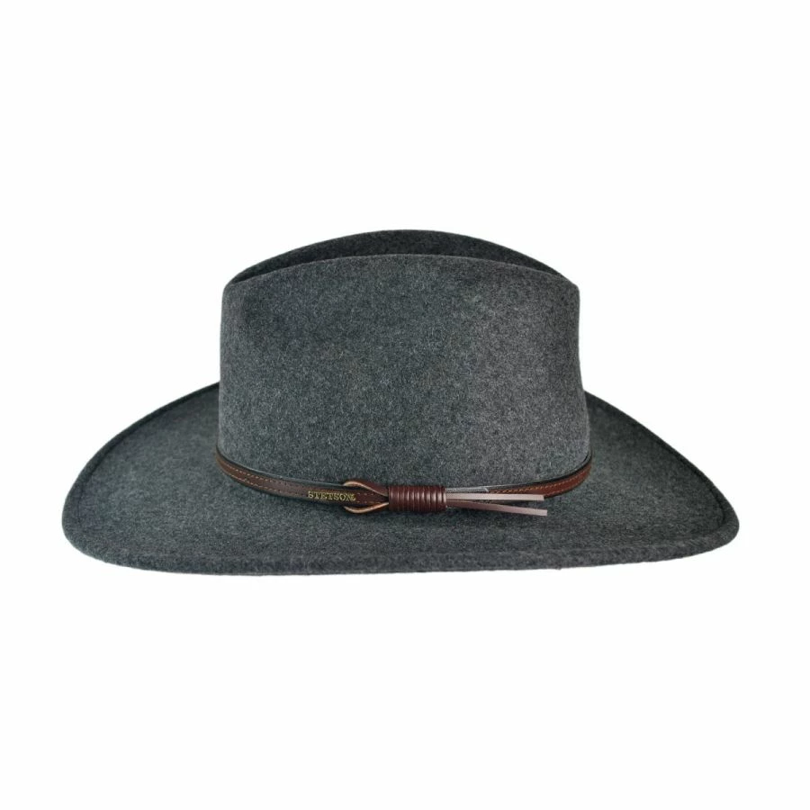 The Stetson Grey Bull Crushable Wool Felt Aussie Hat is the perfect hat to travel with! The Grey Bull conforms to different head shapes and pops back into shape, which makes packing in a suitcase, backpack, or duffel bag easy and carefree. Complete with a DRI-LEX® moisture management sweatband, this crushable hat’s sweatband is comfortable, breathable, and quick drying.