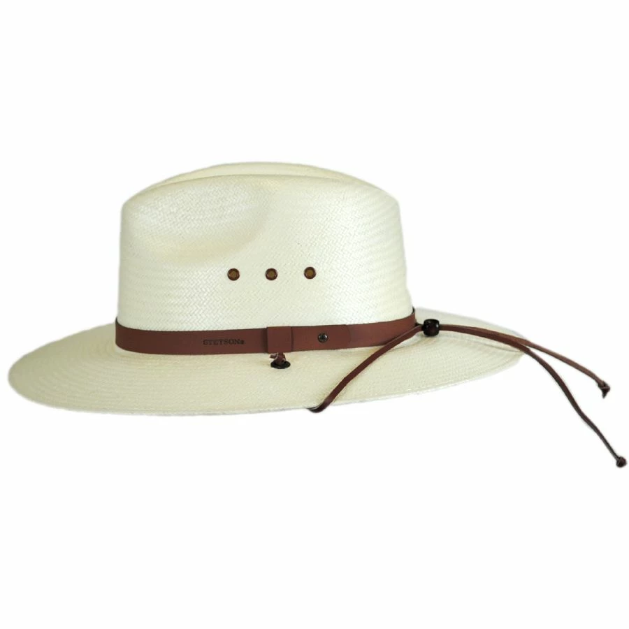 Sleek and streamlined, the Los Alamos Toyo Straw Chincord Western Hat by Stetson features a cool and lightweight toyo straw body in a classic western shape. Trimmed with a smooth leather hat band emblazoned with the Stetson logo at the side, the Los Alamos also features three grommets per side to provide extra ventilation; inside, a Dri-Lex sweatband helps wick away sweat. Equipped with a handy leather chincord, the Los Alamos will stay on during activity or windy conditions while keeping you shaded and cool.