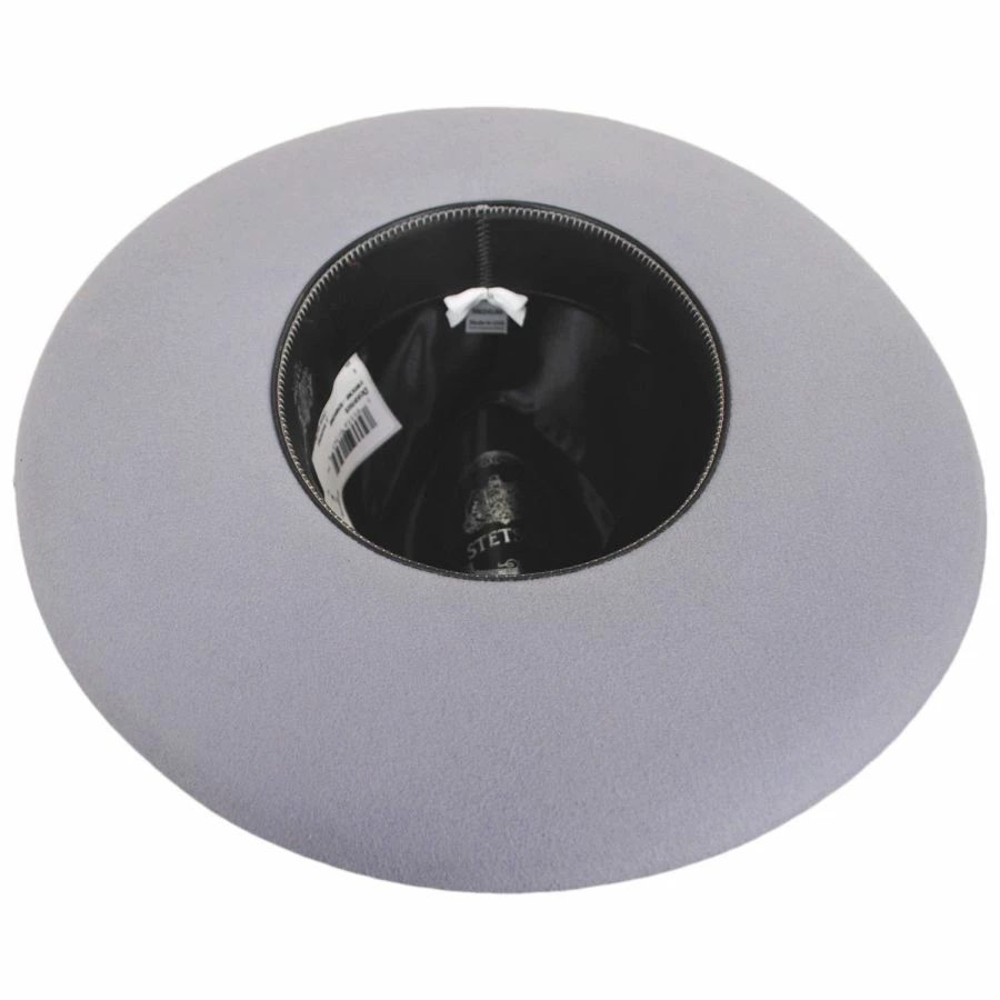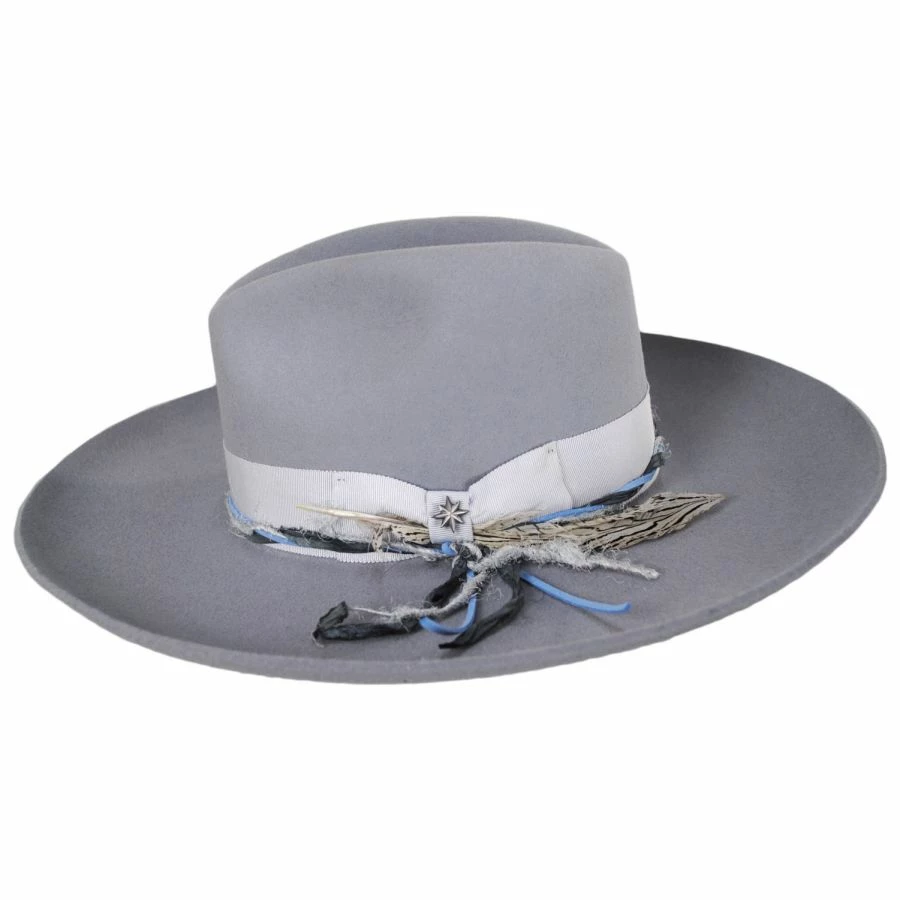 Stetson’s Oceanus Wide Brim Wool Felt Fedora Hat is part of their Seeker collection. Made in the USA with a stiff body, the Oceanus’ stand out features are the crown adornments. At the base, we have a grosgrain ribbon band. Two hand dyed silk cord bands have been twisted together and placed on top of the grosgrain ribbon, completing the multi-layered hat band. A sleek and delicate feather has been slipped into a grosgrain ribbon cross piece and finally, a star shaped metal hat pin sits on top. Step out in a hat that brings a little extra to the table.
