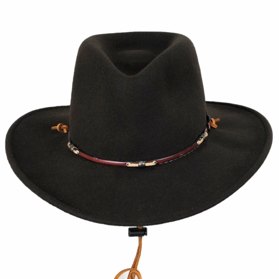 Attention to detail is what makes Stetson’s Wildwood Crushable Wool Felt Outback Hat such a stunning hat. With its leather hat band thoughtfully crafted with cord and toggle accents, the Wildwood is a one-of-a-kind hat that is sure to impress. A leather chin cord with toggle allows the wearer an extra secure fit.